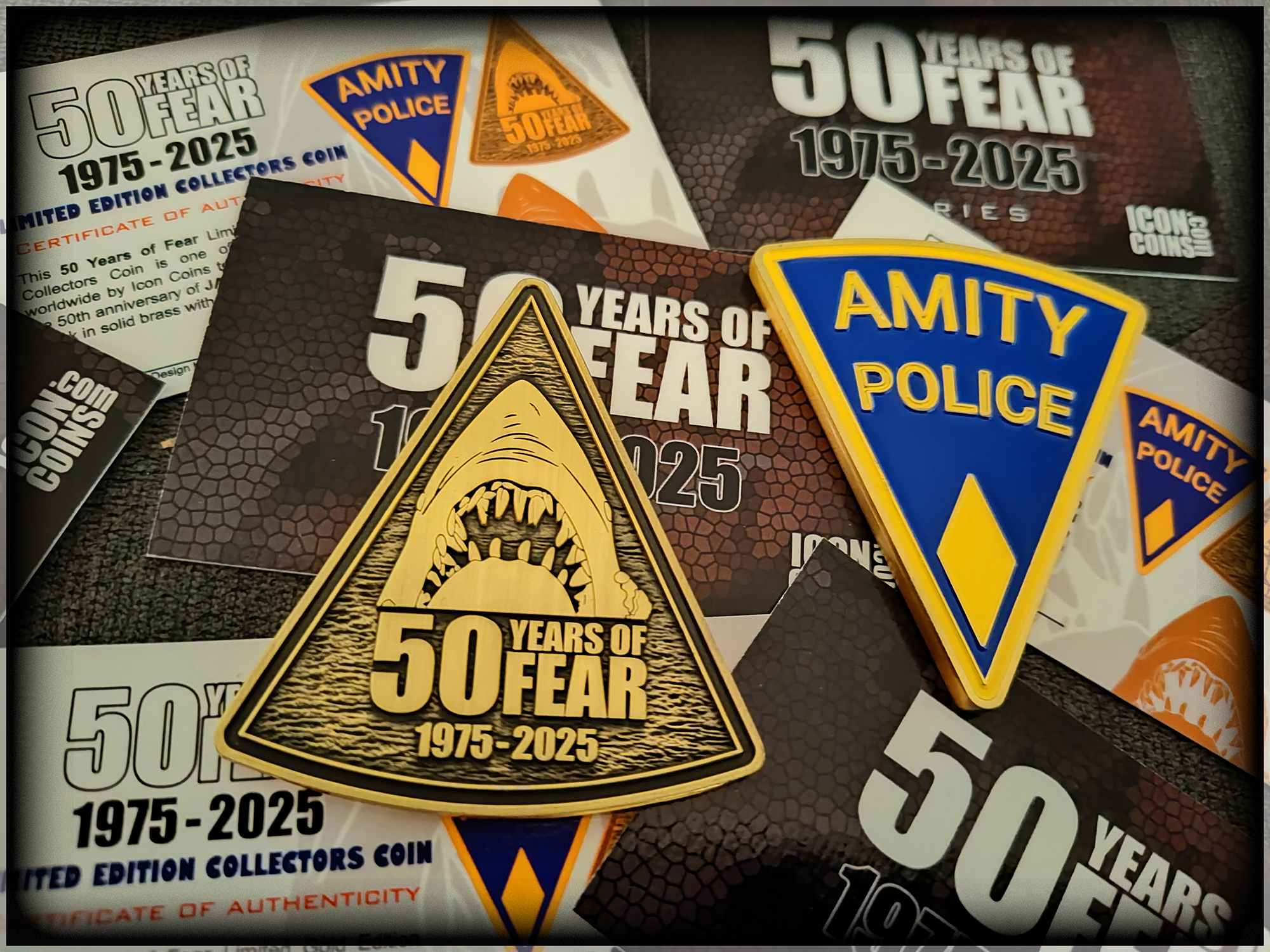 Celebrate the 50th anniversary of the iconic blockbuster JAWS with this Limited Edition Collectors Coin by Icon Coins! Each coin is die struck in solid brass with an antique gold finish. The front side features a recreation of the Amity Police patch worn by our favorite chief, Brody, with glass enamel color inlays. The reverse side features the 50 Years of Fear logo and sketch art version of everybody’s favorite Great White!!